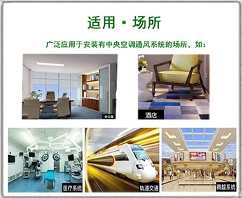 中央空調(diào)風(fēng)口式空氣凈化消毒裝置借助中央空調(diào)風(fēng)口位置的高度優(yōu)越性,采用靜電集塵、電離子殺菌、降解吸附等為一體的空氣凈化技術(shù),殺菌、去除PM2.5、除甲醛等多功能凈化,讓室內(nèi)空氣實(shí)現(xiàn)有效循環(huán)和全面潔凈。